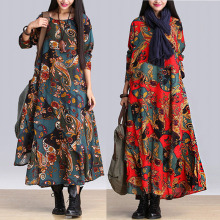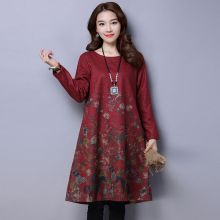 大码女装2016秋冬新款复古印花中长款宽松显瘦棉麻加厚连衣裙胖mm