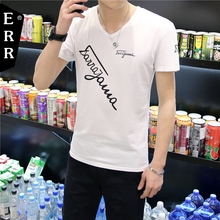 男士夏季新款潮流个性字母印花V领修身青少年打底衫短袖T恤男
