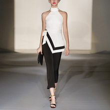 DF夏季气质名媛两件套露肩上衣七分裤套装女装夏装时尚潮2017新款