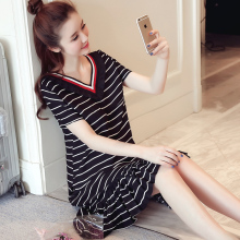 孕妇装2017新款夏装韩版条纹显瘦中长款潮妈上衣孕妇连衣裙可哺乳