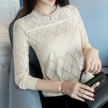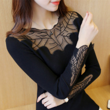 针织衫女短款长袖春夏韩版镂空宽松薄套头网纱上衣拼接蕾丝打底衫