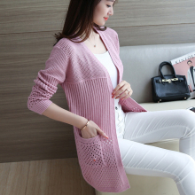 开衫女装春新款纯色韩版宽松毛衣中长款针织开衫女外套口袋披肩薄