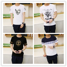 潮流夏季新款男装t恤拼接民族林弯弯短袖T恤男潮韩版圆领半袖青年