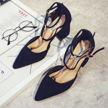 与格链子凉鞋女尖头粗跟T型带金属装饰高跟鞋包头性感扣带2017新