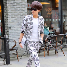 青少年七分袖西服男士英伦印花小西装学生修身中袖套装潮流七分裤
