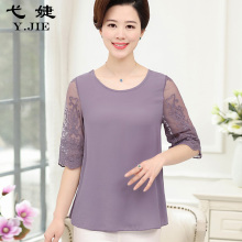 弋婕2017新款中老年女装夏装雪纺中袖t恤妈妈装纯色圆领打底衬衫