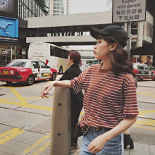 2017新款女装韩版学院风宽松咖啡色经典条纹五分袖短袖T恤上衣