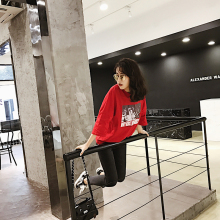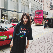 2017春装新款女装韩版宽松显瘦彩色字母T恤中长款五分袖短袖上衣