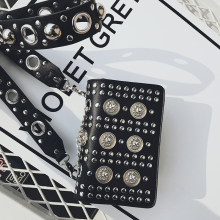 米莎2017新款穿孔朋克铆钉小方包时尚徽章链条斜挎包包