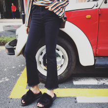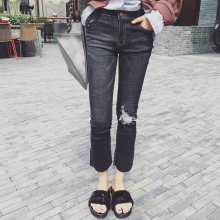 韩版原宿风显瘦破洞高腰铅笔裤牛仔裤黑色九分裤喇叭裤女裤子