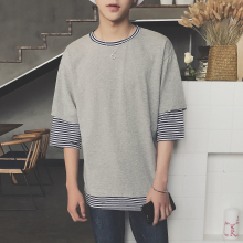 夏季新款撞色条纹五分袖男韩版宽松圆领套头青少年休闲短袖t恤男