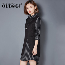 OUBOGJ条纹衬衫女长袖2017春装新款宽松韩版中长款衬衣马甲两件套