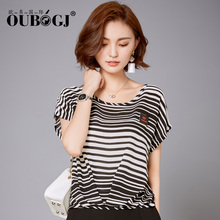 OUBOGJ雪纺衫短袖宽松韩版女装夏装新款气质雪纺上衣圆领条纹t恤