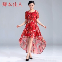 卿本佳人新品时尚欧美印花雪纺中长款连衣裙女显瘦圆领花色大摆裙