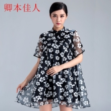 卿本佳人2016夏季新款欧根纱烧花小梅花短袖宽松大摆黑色连衣裙女