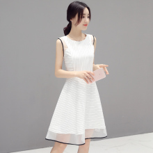 2017新款夏季女装欧根纱黑白条纹无袖雪纺连衣裙夏中裙修身a字裙