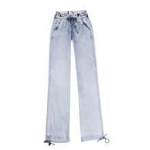 松紧腰抽绳天丝牛仔裤超薄垂坠阔腿裤宽松浅蓝色