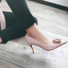 高跟鞋春季2017新款女百搭细跟鞋樱花扣水钻性感尖头浅口mb女单鞋
