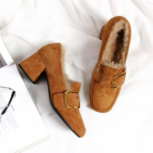 2017秋冬季新款真毛女鞋兔毛方扣真皮粗高跟鞋毛毛鞋棉鞋女单鞋