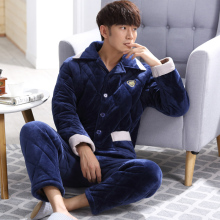 美甘甘冬季新款男士加厚法兰绒夹棉睡衣 男士珊瑚绒加绒家居服