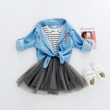 女童套装2017春新款儿童宝宝两件套系带牛仔衬衫+条纹背心裙纱裙