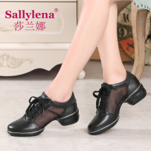 莎兰娜夏季广场舞鞋网面软底舞蹈鞋女式真皮成人跳舞鞋女鞋子中跟