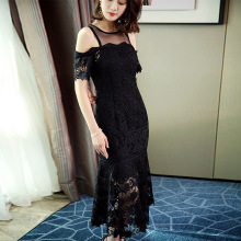 2017春夏欧美新款连衣裙时尚蕾丝镂空漏肩长款包臀修身连衣裙