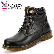 花花公子秋冬男士马丁靴英伦真皮靴子男靴军靴短靴高帮工装鞋子黑
