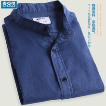 新款原创亚麻衬衫男小立领春秋季男士衬衣休闲修身圆领长袖蓝寸衫