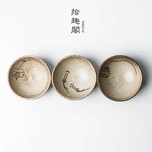 【拾趣阁】纯手工粗陶茶杯 日式手工杯 手绘陶瓷品杯手工刻绘图案