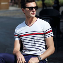 夏季男士短袖潮流修身休闲V领横条纹半袖韩版丝光棉t恤男欧美简约