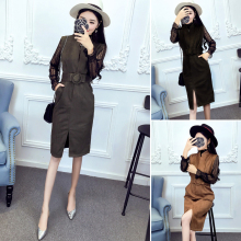 2017春装新款韩版气质透视蕾丝衫上衣+V领背心麂皮绒连衣裙套装潮