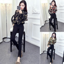 2017春装新款韩版气质时尚花色高领长袖上衣+修身开叉长裤套装女
