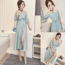 2017春季新款韩版时尚性感一字领露肩排扣收腰开叉中长裙连衣裙潮