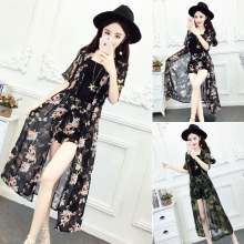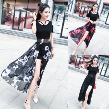 2017夏季新款时尚印花雪纺拼接露肩短袖开叉连衣裙+高腰短裤套装