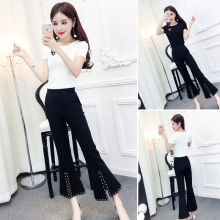 2017夏装新款韩版气质圆领短袖T恤衫上衣+高腰修身开叉阔腿裤套装