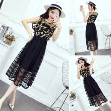 2017夏季新款韩版无袖圆领刺绣拼接网纱中长连衣裙+吊带裙两件套