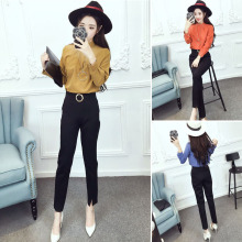 2017春装新款韩版气质百搭高领长袖上衣+修身开叉长裤时尚套装女