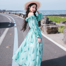 2017夏装新款波西米亚海边度假裙花色雪纺海滩裙露肩连衣裙长裙女