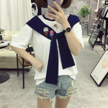 休闲百搭t恤女夏季2017新款学生宽松打底衫假两件吊带短袖上衣服
