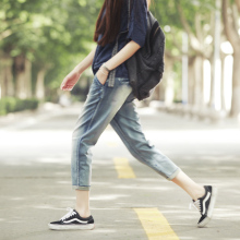 磨白蓝色薄款牛仔裤 七分裤九分裤 宽松小脚铅笔女裤