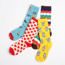 日系女纯棉中筒袜子卡通机器人潮流滑板袜撞色个性原宿民族风女袜