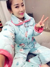 包邮法兰绒夹棉睡衣长袖套装保暖家居服女士秋冬季加厚大码珊瑚绒