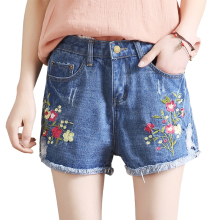 韩版宽松牛仔短裤女夏季2017新款修身刺绣花破洞翻遍热裤直筒毛边
