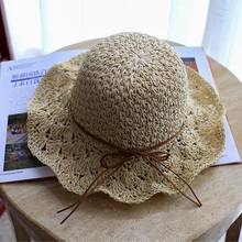 手工勾针日系草帽大沿折叠沙滩帽女夏海边渡假蝴蝶结遮阳帽太阳帽