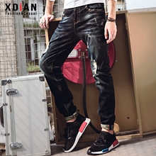 续点复古黑色牛仔裤男韩版猫须破洞牛仔长裤男修身小直筒潮秋季