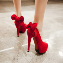 水钻红色新娘鞋细跟超高跟女单鞋防水台蝴蝶结婚纱白鞋性感夜店鞋