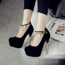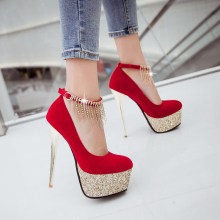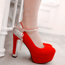 春季新款性感超高跟粗跟防水台一字带亮片水钻红色婚鞋夜店女单鞋