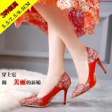 新款中国风红色婚鞋民族风细跟高跟尖头绸缎秀禾女单鞋大码40-43