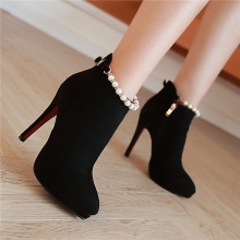 秋鞋冬靴红色婚鞋侧拉链尖头马丁靴细跟高跟串珠单靴短筒短靴女鞋